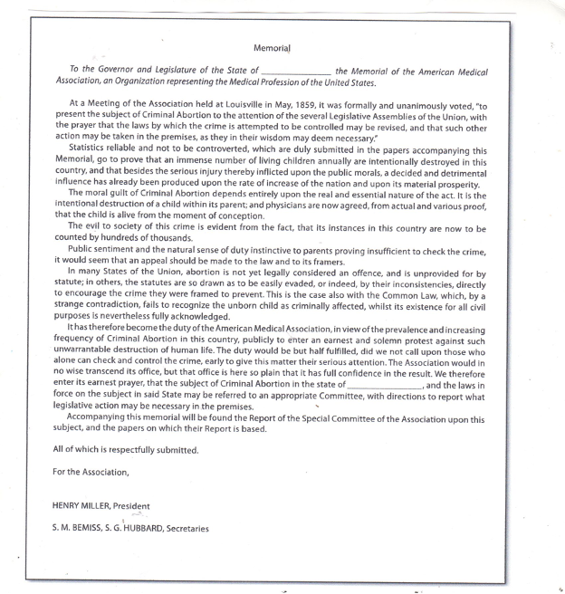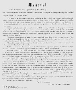 AMA považovala za povinnosť tejto novovzniknutej profesijnej organizácie pustiť sa do potratov, pretože spoločnosť si neplní svoje povinnosti, a v Memoriáli sa uvádza, že “verejný sentiment a prirodzený zmysel pre povinnosť, ktorý je rodičom inštinktívny, sa ukázali ako nedostatočné na kontrolu tohto zločinu … Preto sa stalo povinnosťou Americkej lekárskej asociácie, vzhľadom na rozšírenosť a rastúcu frekvenciu kriminálnych potratov … verejne vstúpiť do vážneho a slávnostného protestu proti takémuto neoprávnenému ničeniu ľudského života.”