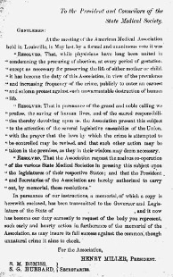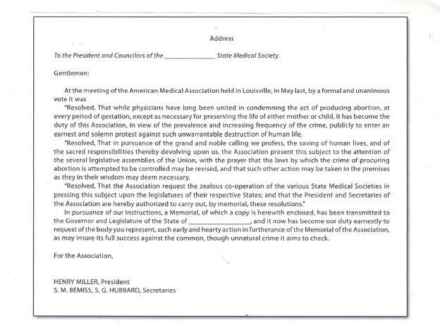 V Memoriáli a príhovore adresovanom federálnym a štátnym vládam a lekárskym spoločnostiam sa odporúčalo, aby sa zákony upravujúce “zločin [potratu]” revidovali a posilnili. Obsahoval vyjadrenia, ktoré by sme dnes mohli mylne považovať za tvrdé výrazy, vyjadrujúce ľútosť nad “obrovským počtom živých detí, ktoré sú v tejto krajine ročne úmyselne zničené, a…vážnou ujmou, ktorá je tým spôsobená verejnej morálke…”