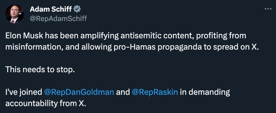V utorok títo zákonodarcovia, vrátane významných osobností, akými sú napr. poslanci. Dan Goldman, Jamie Raskin, Jerry Nadler, Bennie Thompson, Katie Porter a Adam Schiff, adresovali list Linde Yaccarino, výkonnej riaditeľke spoločnosti X, a Elonovi Muskovi, jej majiteľovi.