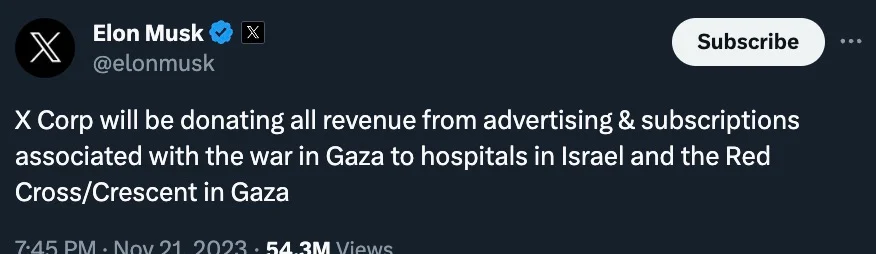 Elon Musk nedávno vyhlásil, že všetky príjmy spoločnosti X z reklám a predplatného na obsah týkajúci sa konfliktu budú venované charitatívnym organizáciám v postihnutom regióne.