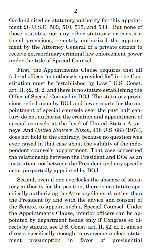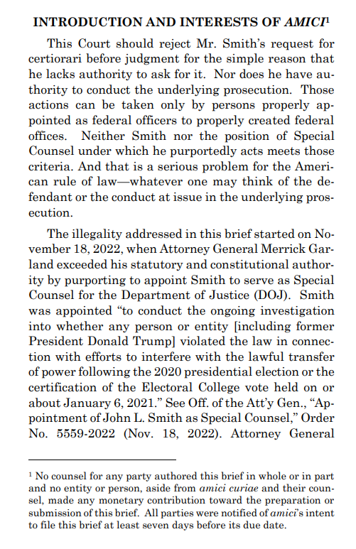 Preskúmanie vecí najvyšším súdom je zložitejšie, pretože bývalý generálny prokurátor Edwin Meese III a profesori práva Steven G Calabresi a Gary S Lawson podali podanie ako Amici Curiae (priateľ súdu, nie je spojený ani s jednou zo strán), v ktorom spochybňujú legitimitu Bidenom vymenovaného osobitného poradcu Jacka Smitha.