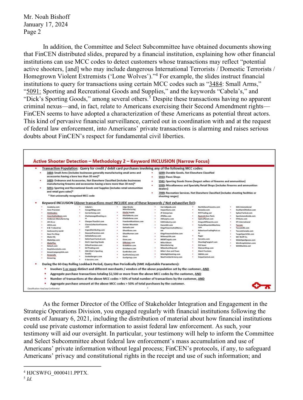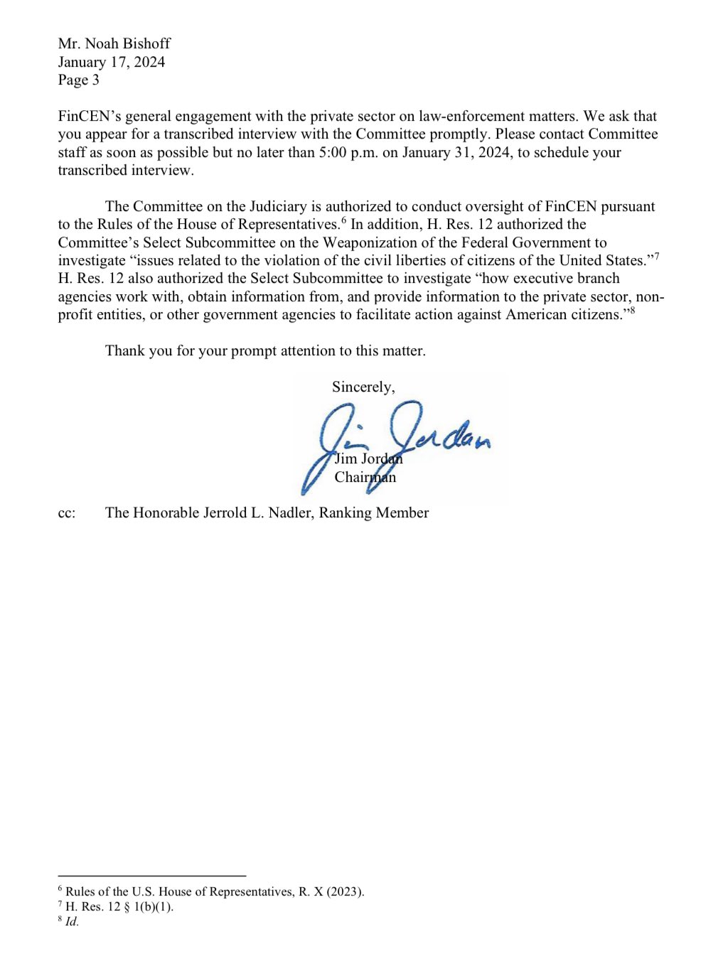 Jordan pripojil list svojho výboru Noahovi Bishoffovi, bývalému riaditeľovi Úradu ministerstva financií’pre integráciu a zapojenie zainteresovaných strán do strategických operácií Siete na presadzovanie finančných trestných činov (FinCEN), v ktorom žiada, aby Bishoff vypovedal o ohavnom správaní federálnych vyšetrovateľov.