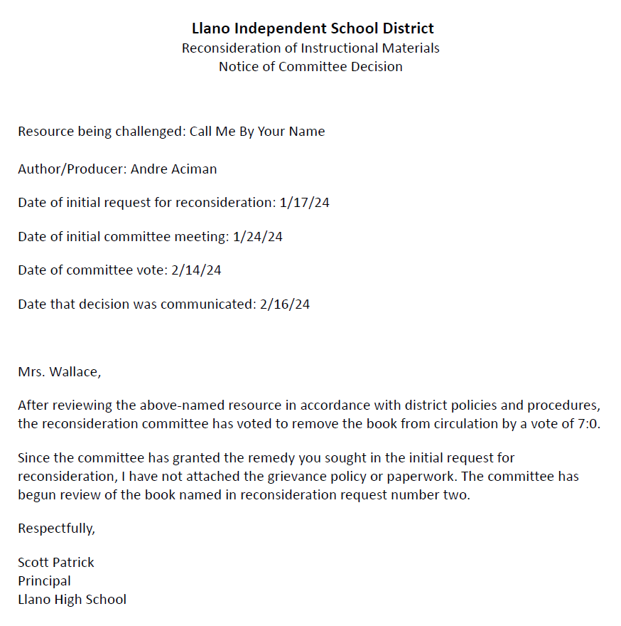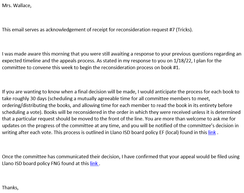 Rodičia nahlásili 198 kníh na strednej škole v Llane ako porušujúce nariadenie Texas Education Agency’a Texas READER Act. Pri tempe deviatich pracovných mesiacov ročne z Patrickovho’e-mailu vyplýva, že školský obvod Llano by strávil recenzovaním citovaných kníh viac ako 22,5 roka.