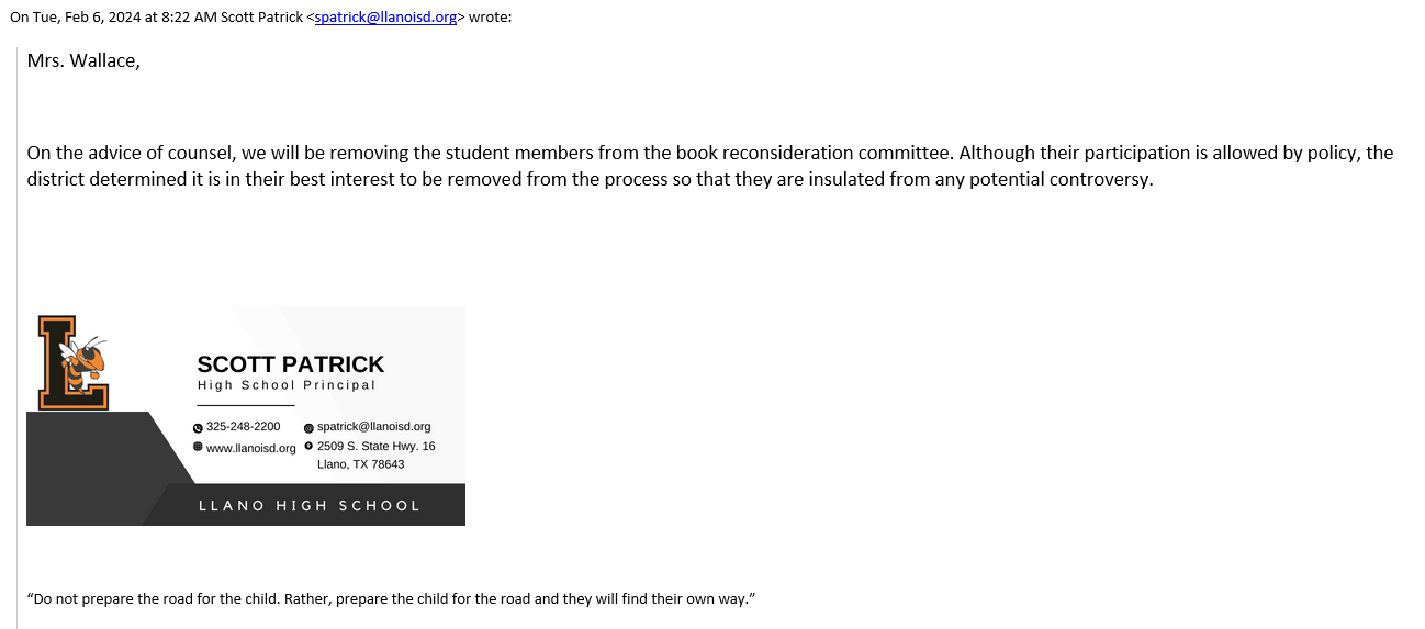 Na otázky denníka The Daily Signal’o tom, ako sa študenti dozvedeli o komisii na recenzovanie kníh a boli do nej zaradení, alebo prečo ich Patrick zrazu odstránil, Patrick ani žiadny iný administrátor v školskom obvode Llano neodpovedal.