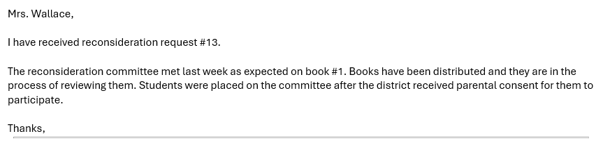 V e-maile z 22. januára, ktorý získal The Daily Signal, Patrick Wallaceovi a ďalším rodičom vysvetlil, ako bude školský obvod citované knihy skúmať. Riaditeľ uviedol, že predpokladá, že tento proces bude trvať “približne 30 dní” pre každú knihu. Z jeho e-mailu vyplýva, že výbor bude knihy skúmať postupne.