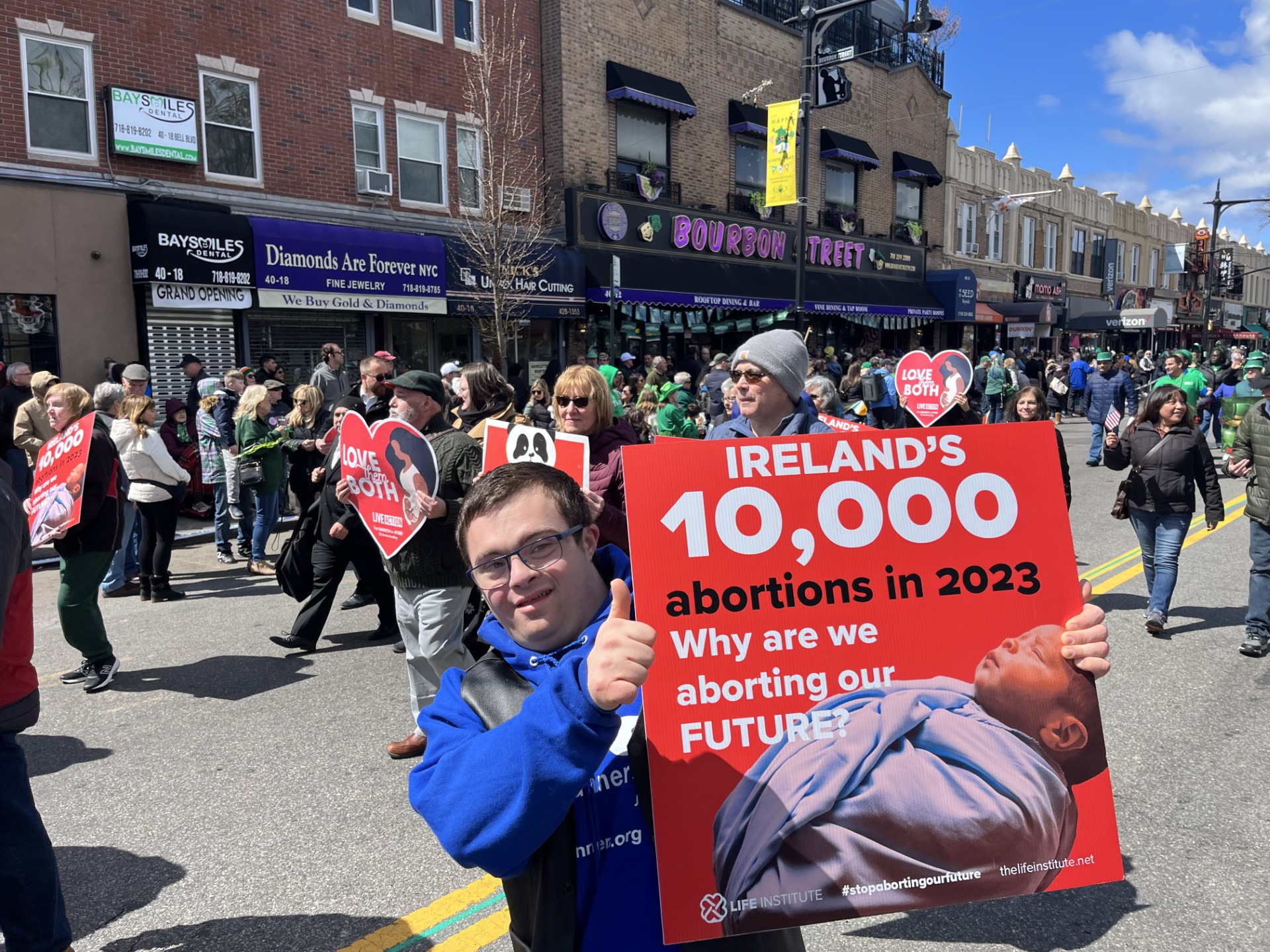 Podpora bola na mieste. Organizátori samostatného sprievodu, svetoznámeho newyorského sprievodu na Deň svätého Patrika na Manhattanskej Piatej avenue, vylúčili a vyhýbali sa skupinám za život, ktoré vystavovali svoje vlastné transparenty.