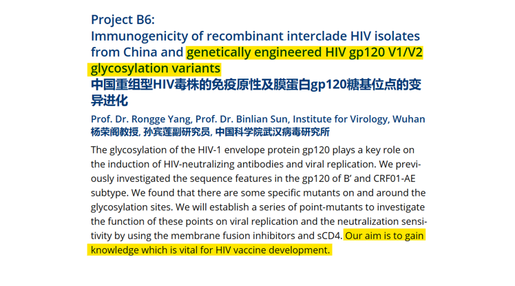 Ako je možné vidieť na v popise nižšie, podprojekt B6 projektu TRR60 pod vedením profesorov Rongge Yanga a Binliana Suna z Wuhanského ústavu virológie sa venoval štúdiu “geneticky upravených variantov glykozylácie gp120 V1/V2 HIV” na účely uľahčenia “vývoja vakcíny proti HIV.”