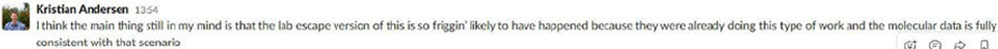 Andersen to napísal svojim kolegom tesne predtým, ako sa dostal do slávneho konferenčného hovoru z 1. februára 2020, počas ktorého nemecký špecialista na koronavírusy Christian Drosten a holandský výskumník v oblasti zisku funkcií Ron Fouchier, ako je známe, ich tvrdo pokarhali za to, že sa zaoberali hypotézou “úniku z laboratória”.