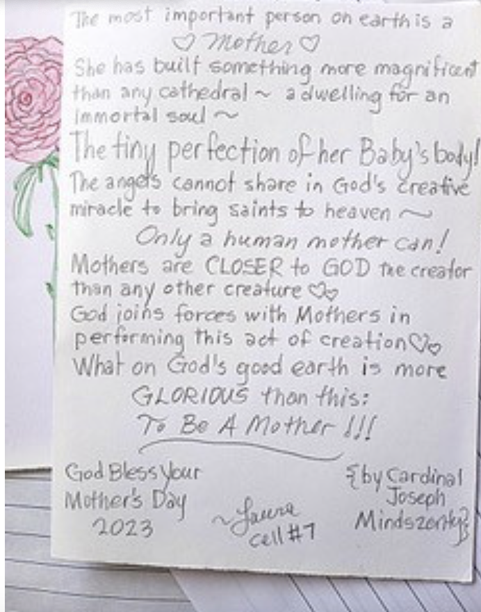 P.S. Toto je pohľadnica ku Dňu matiek’ktorú som minulý rok napísala a nakreslila pre každú zo 60 spoluväzenkýň. Je na ňom krásny citát kardinála Jozefa Mindszentyho o materstve: