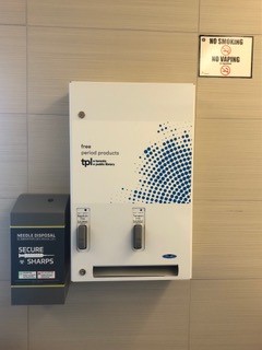 V súčasnosti sú na všetkých miestach knižnice menštruačné výrobky na dámskych a pánskych toaletách zadarmo.