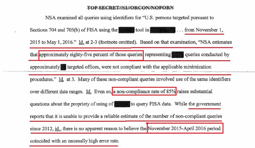 Osemdesiatpäť percent vyhľadávaní vykonaných od roku 2012 nebolo v súlade s predpismi. Zamyslite sa nad rozsahom vyhľadávania v databázach a nad zámermi a cieľmi v nich. V čase príchodu prezidenta Trumpa ako kandidáta GOP v roku 2016 bolo sledovanie rozsiahle, často používané a úplne pohodlná FBI a DOJ-NSD ho už nespochybňovali.