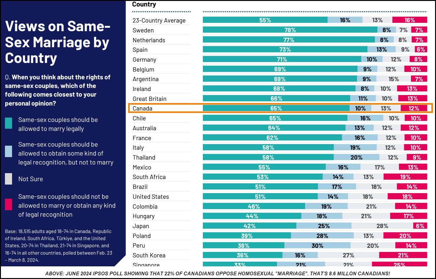 V roku 2024 Ipsos v prieskume verejnej mienky zistil, že 12 percent Kanaďanov je proti “homosexuálnym manželstvám.” Ďalších 10 percent uviedlo, že párom rovnakého pohlavia by nemalo byť povolené uzatvárať manželstvá, ale mohli by získať určitú formu právneho uznania.