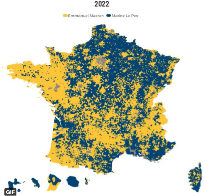 Táto mapa z roku 2022 nižšie ukazuje prudkosť pravotočivej zákruty vo Francúzsku len za dva roky: