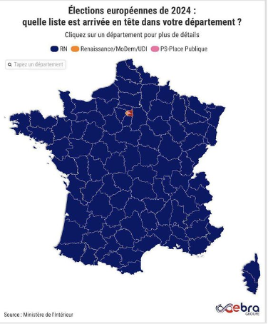 Francúzsko zaznamenalo najväčší zisk pre politiku priateľskú k obyvateľstvu, pričom pravicová strana Národné zjednotenie (RN) získala až 33 percent hlasov: viac ako dvojnásobok oproti strane prezidenta Emmanuela Macrona’. Na nasledujúcej mape sú modrou farbou vyznačené miesta, kde zvíťazili nacionalisti: