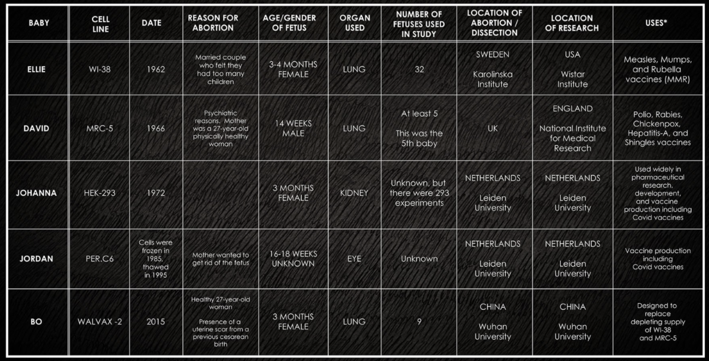Najnovšia bunková línia pochádza od Bo, dieťaťa zabitého v roku 2015, aby sa nahradili vyčerpávajúce sa zásoby bunkových línií. Hrôzostrašné je, že potratené deti’bunkové línie sú dodnes na predaj.