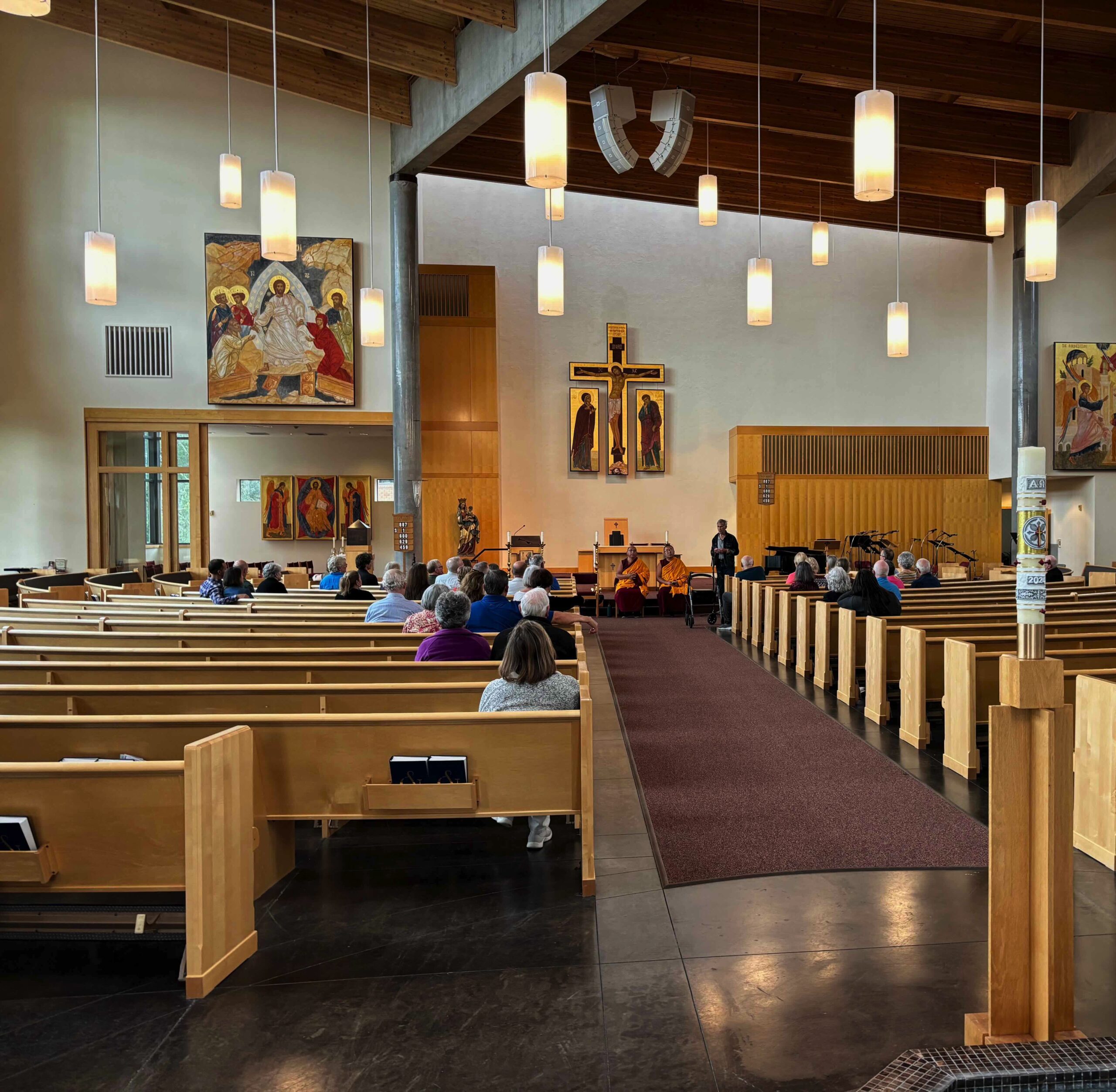 Tibetskí budhistickí mnísi poučovali katolíkov o svojich náboženských praktikách a viedli ich v nekresťanských spevoch v katolíckom kostole v Oregone.