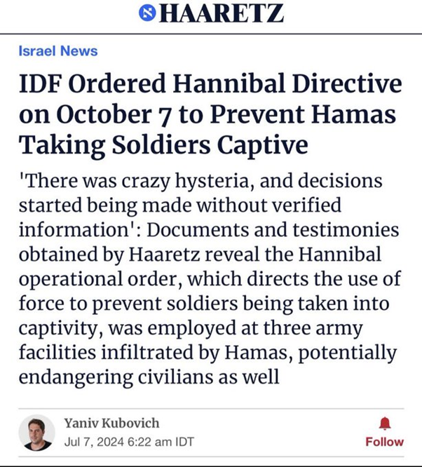 7. júla 2024 izraelské noviny Haaretz zverejnili tvrdenia o dôkaze, že izraelské ozbrojené sily dostali pokyn zabíjať Izraelčanov, aby zabránili ich zajatiu.