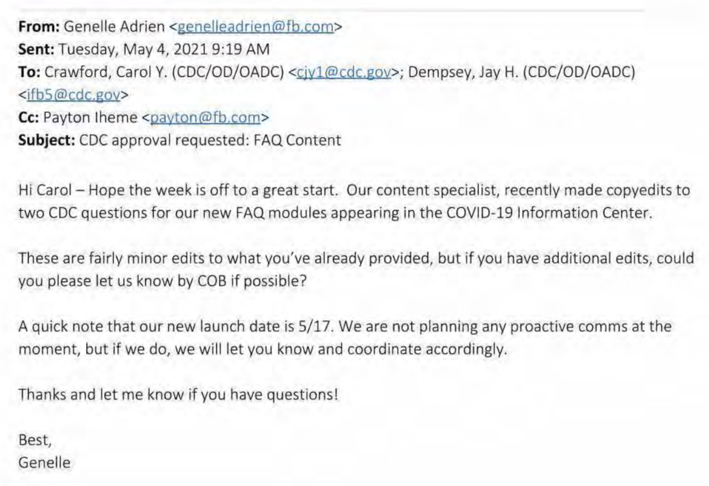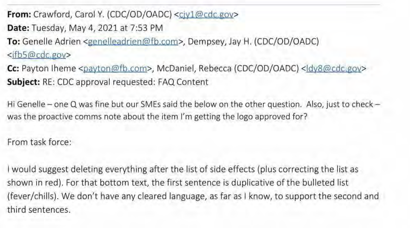 Genelle Adrienová (z Politics and Government Outreach Team na Facebooku) a Crawford “hviezdia” v reťazci e-mailov, ktorý získala AFL, pričom druhý menovaný bol priamo požiadaný, aby CDC schválilo Facebook’“COVID-19 Information Center FAQ.”