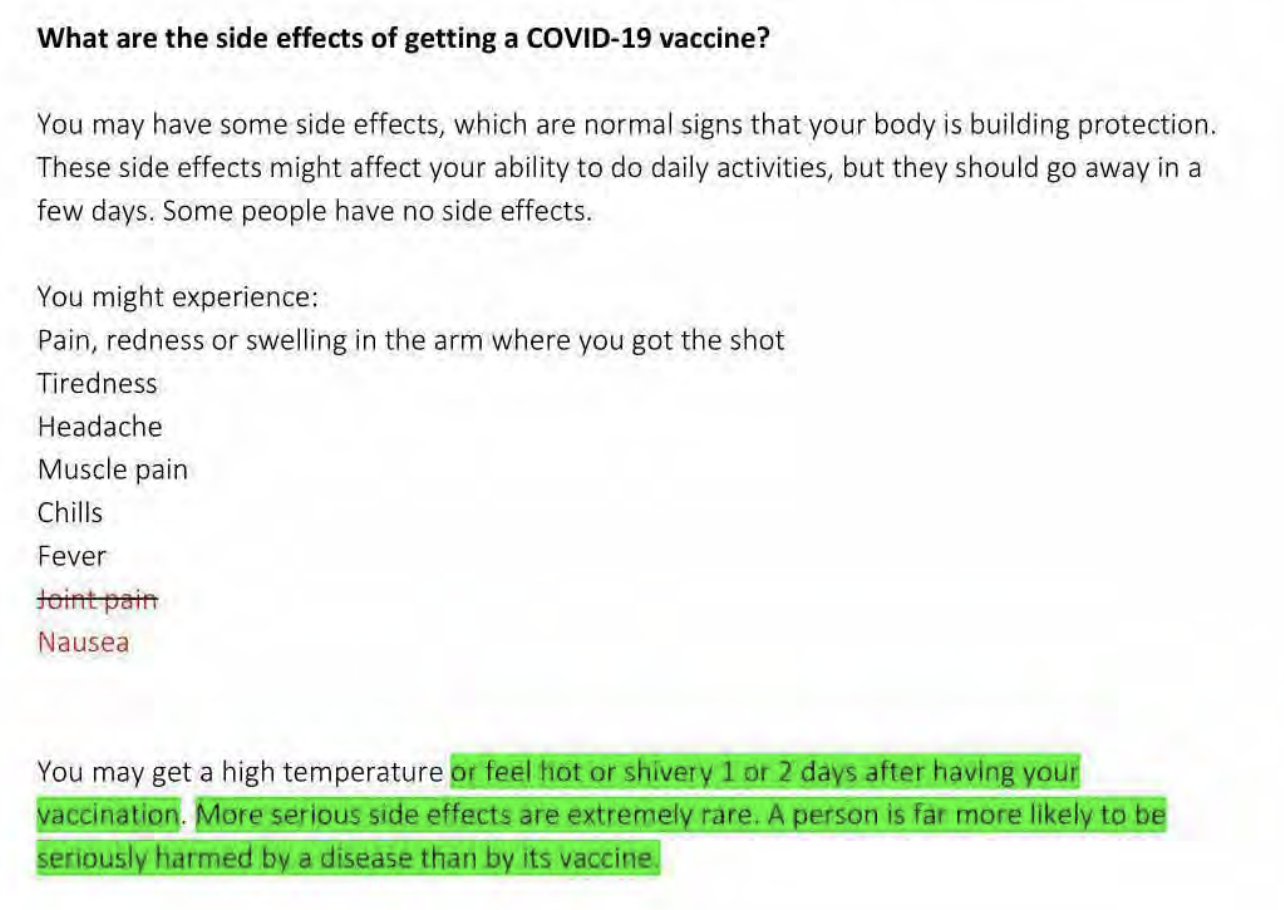 Takto “bolesť kĺbov” zmizla, ale “nevoľnosť” bola pridaná ako možný vedľajší účinok. A potom z toho, čo spoločnosť Facebook pripravila ako svoje často kladené otázky o bezpečnosti vakcíny COVID, zmizli celé tieto dve vety: