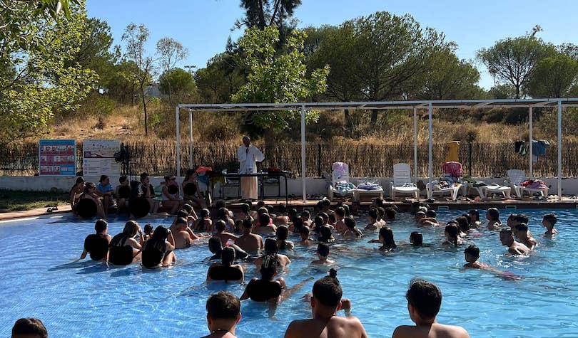 Španielsky saleziánsky kňaz celebroval svätú omšu na brehu bazéna a dovolil chlapcovi a dievčaťu v plavkách, aby pozdvihli kalich a hostiu.