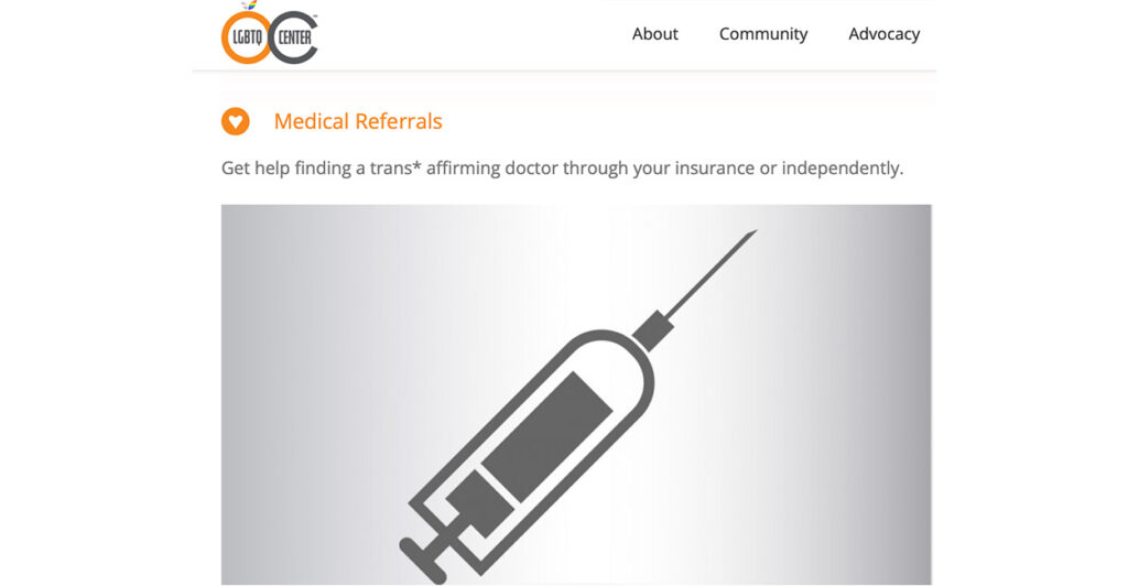 Centrum LGBTQ’s webové stránky má tiež formulár, ktorý spája neplnoletých s lekármi, ktorí predpisujú sterilizačné hormonálne terapeutické režimy a vykonávajú nezvratné operácie na zmenu pohlavia.