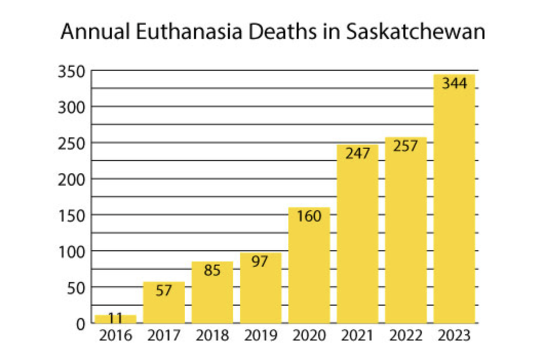 Saskatewanský zdravotnícky úrad oznámil Koalícii na prevenciu eutanázie, že v roku 2023 došlo k 344 úmrtiam v dôsledku asistovanej samovraždy, pričom v roku 2022 ich bolo 257, čo predstavuje 33-percentný nárast len za jeden rok.