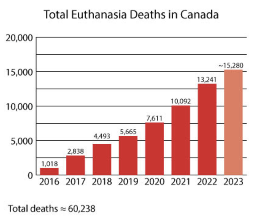 Dňa 8. júla 2024 sme uverejnili článok, v ktorom sa na základe údajov z provincií Ontario, Quebec, Britská Kolumbia, Manitoba, Alberta a Nové Škótsko odhaduje, že v roku 2023 bolo v celej krajine približne 15 280 úmrtí na eutanáziu, čo predstavuje nárast o 15,4 %.