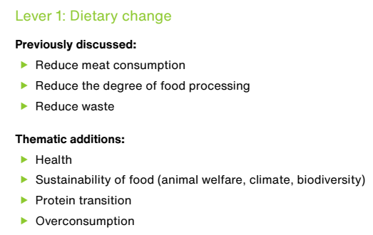 Aby sa “zmenilo správanie spotrebiteľov, znížila spotreba mäsa alebo optimalizovalo a rozšírilo šľachtenie bielkovinových rastlín,” Rímsky klub navrhuje, aby vlády použili donucovacie daňové opatrenia a zaviedli “zákon o dodávateľskom reťazci poľnohospodárskych výrobkov”, aby sťažili život tým, ktorí ho nedodržiavajú.