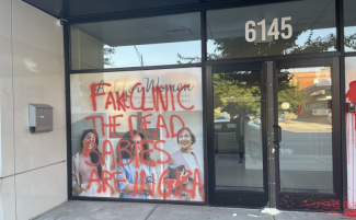 Niekto nastriekal sprejom nápis “Falošná klinika, mŕtve deti sú v Gaze” na prednú stranu kliniky Aid for Women v štvrti Edgewater na severnej strane mesta.
