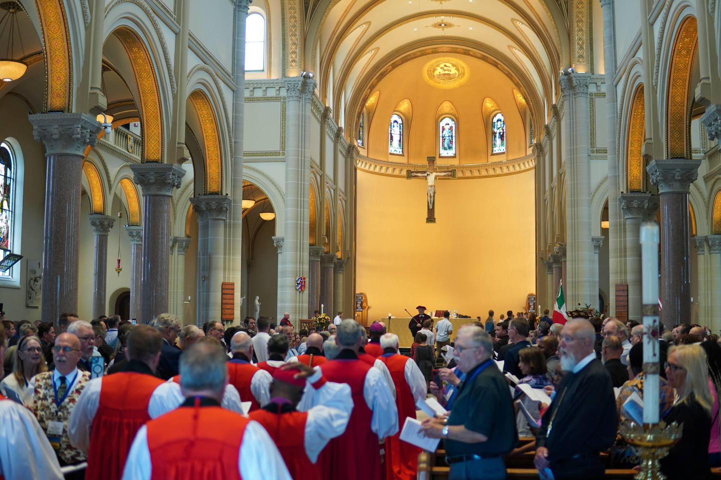 Počas celého zhromaždenia sa v študentskej kaplnke, v telocvični univerzitného areálu a, čo je najviditeľnejšie, v Bazilike svätého Vincenta slávili “anglikánske eucharistie”. Pôsobivo jasné fotografie z “eucharistie”, ktorá sa konala 26. júna v bazilike – ktoré si môžete pozrieť kliknutím sem – ukazujú anglikánskych “kňazov” ženského pohlavia, ako postupujú do kostola, nesú evanjelium a slávia liturgiu so svojimi mužskými kolegami.