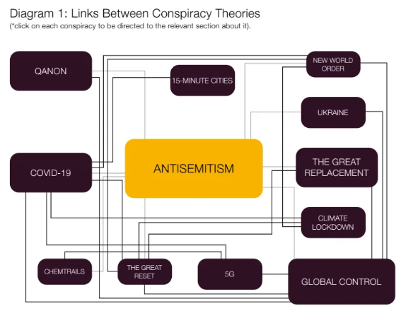 Tento obrázok bol prevzatý z poradne publikácie o antisemitizme, ktorú dostali všetci budúci a súčasní poslanci britského parlamentu v roku 2023. Je označená za “príručku konšpiračných teórií,” snažiacu sa vykresliť odpor verejnosti voči nepopulárnym opatreniam ako formu extrémistickej nenávisti: