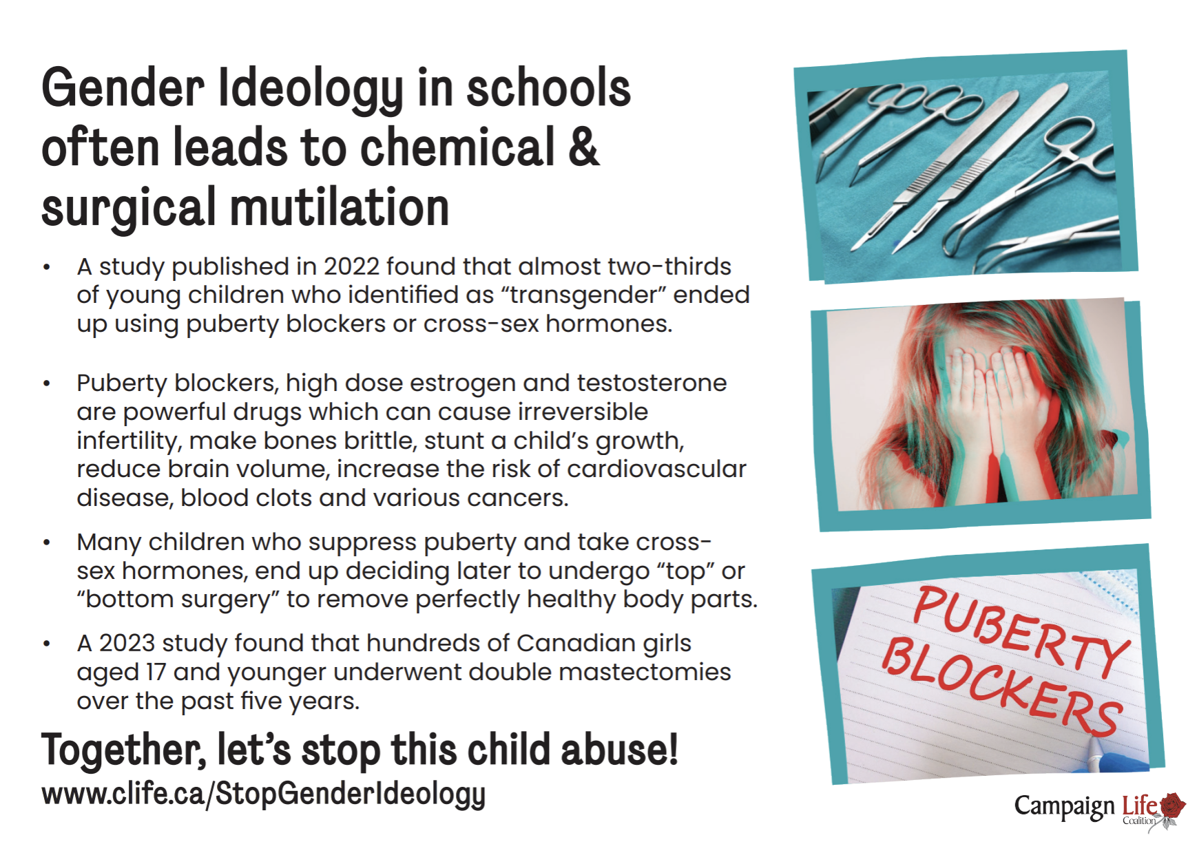“Štúdia z roku 2023 zistila, že stovky kanadských dievčat vo veku 17 rokov a mladších podstúpili za posledných päť rokov dvojitú mastektómiu,” pokračovala s odkazom na online petícia v ktorej boli uvedené zdroje viacerých štúdií odhaľujúcich nebezpečenstvá rodovej “transformácie.”