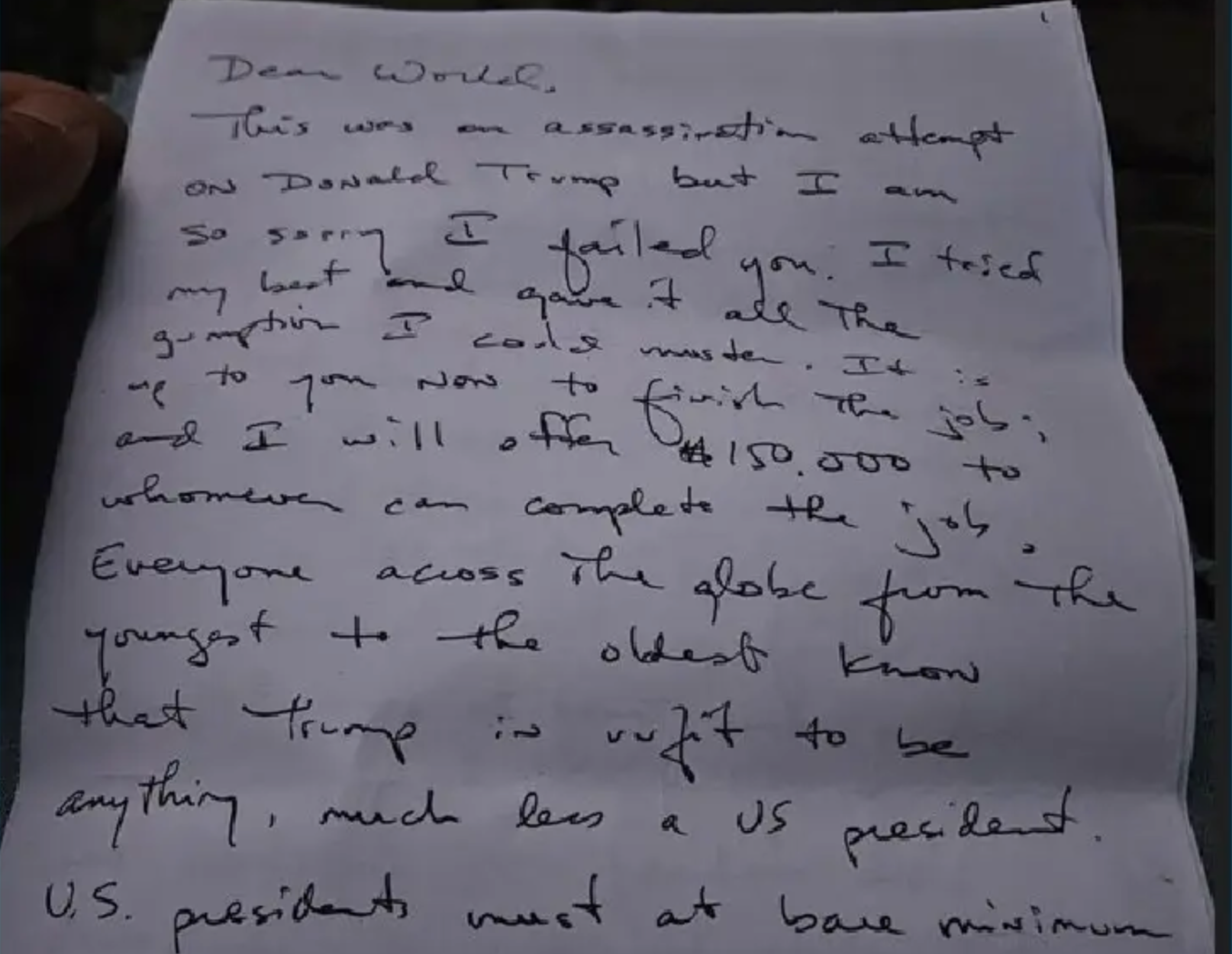 “Drahý svet, bol to pokus o atentát na Donalda Trumpa, ale je mi veľmi ľúto, že som vás zlyhal. Snažil som sa zo všetkých síl a dal som do toho všetko, čo som mohol. Teraz je na vás, aby ste dokončili túto prácu; a ja ponúknem 150 000 dolárov tomu, kto ju dokáže dokončiť,”Routh napísal v liste, ktorý poslal nemenovanému svedkovi 58-ročného”trestného stíhania.
