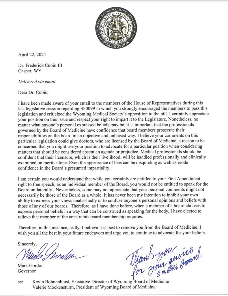 Gordon oznámil svoj zámer odvolať Cubina v liste z 22. apríla. Gordon síce uznal doktorovo’právo na slobodu prejavu vyjadriť svoj názor, ale trval na tom, že päťčlenná lekárska rada musí zostať nestranná. Rada je zodpovedná za vydávanie a obnovovanie licencií lekárov a iných lekárov v štáte spolu s dohľadom nad lekárskou reguláciou, dodržiavaním predpisov a disciplínou.