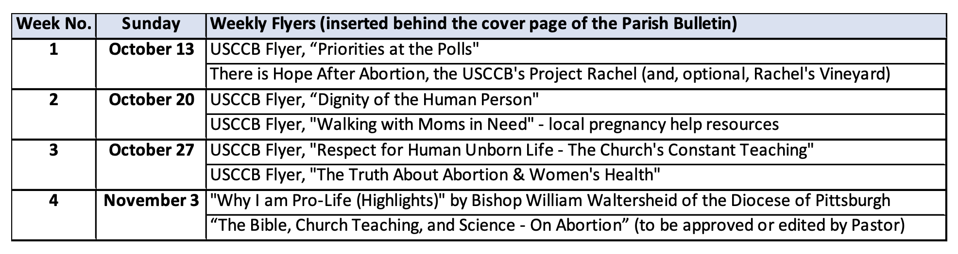Prvý leták, vložka bulletinu USCCB’“Priority vo voľbách”, uvádza, že americkí biskupi naďalej vyhlasujú potraty za svoju “prvoradú prioritu, pretože priamo útočia na samotný život, pretože sa odohrávajú vo svätyni rodiny a kvôli počtu zničených životov.”