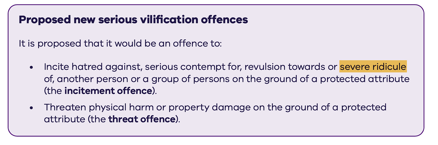 Podľa navrhovaných reforiem by ste mohli byť trestne stíhaní za podnecovanie “vážneho zosmiešňovania” na základe chráneného atribútu s maximálnym trestom odňatia slobody na tri roky.