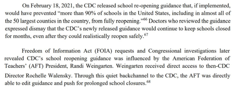 V roku 2021 bývalý riaditeľka CDC Rochelle Walenskyová prepísala na príkaz národného odborového zväzu učiteľov’ usmernenie CDC o sociálnom dištancovaní, čím zaručila, že školy zostanú na mnoho mesiacov uzavreté pre osobné vyučovanie.