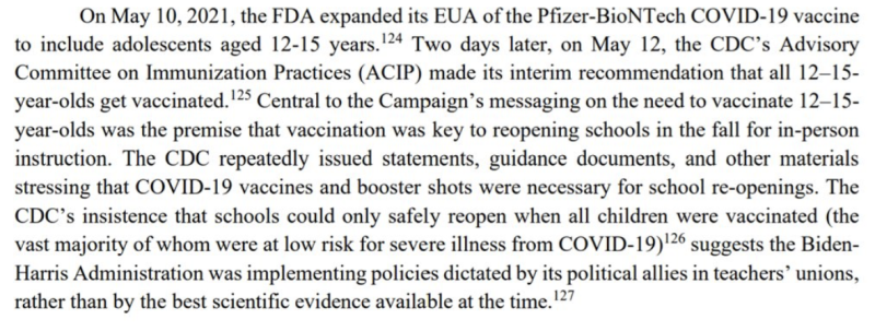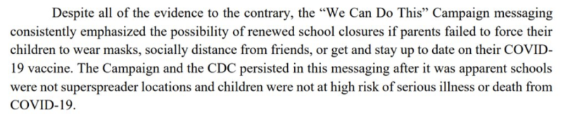 Potom, keď úrad FDA schválil vakcínu pre 12- až 15-ročné deti, PR firma rodičom oznámila, že školy sa môžu otvoriť na jeseň 2021, len ak dajú svoje deti zaočkovať. V týchto reklamách sa nikdy nespomínali vedľajšie účinky, ako napríklad zápal srdcového svalu spôsobený vaxom.