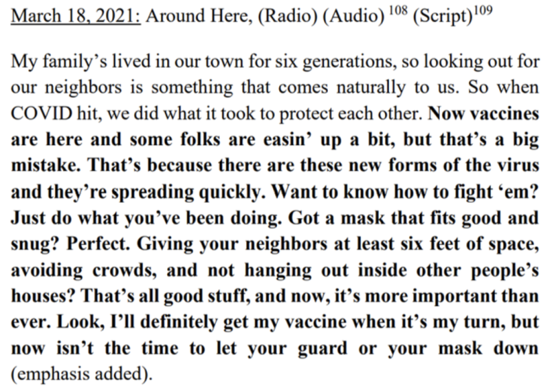 V marci 2021, aj keď CDC povedalo Američanom, že očkovaní sa nemusia maskovať, PR firma spustila reklamu, že masky sú stále potrebné, dokonca aj pre očkovaných. “Nie je’čas poľaviť” nám povedali, pričom chýbali dôkazy, že čokoľvek z toho prinieslo nejaký úžitok.