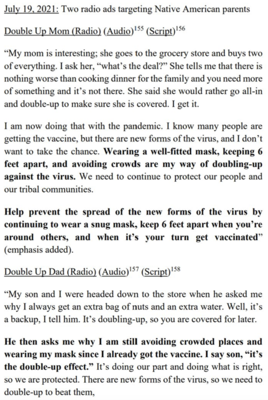 HHS na propagandistickú kampaň najala PR firmu Fors Marsh Group (FMG). Jej hlavným cieľom bolo zvýšiť spotrebu vakcín COVID. Stratégia: 1. Prehnať riziko úmrtnosti na COVID 2. 3. Bagatelizovať skutočnosť, že neexistujú žiadne dobré dôkazy o tom, že vakcína COVID zastavuje prenos.