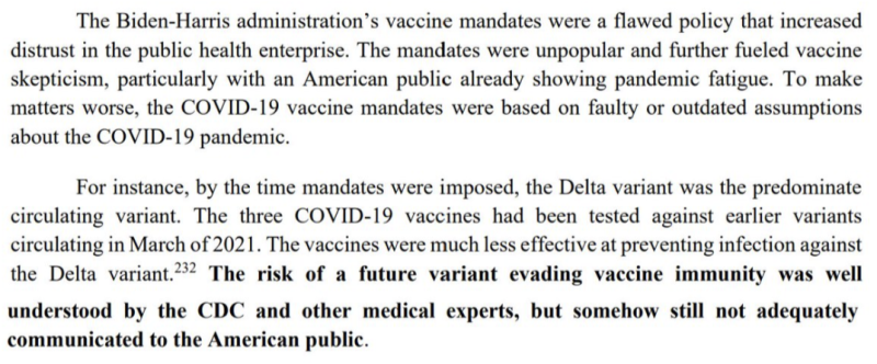 Bidenova/Harrisova administratíva nariadila OSHA, CMS a armádny vax mandát, hoci CDC vedelo, že delta variant sa vyhýba imunite voči vakcíne. PR kampaň sa úzkostlivo vyhýbala informovaniu Američanov o slabnúcej účinnosti vakcín vzhľadom na varianty.