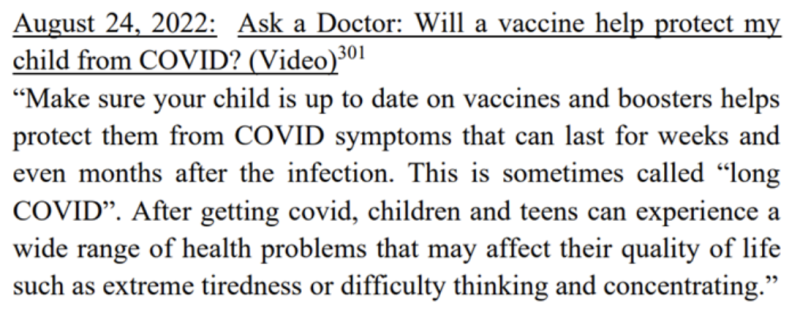 Pri absencii dôkazov propagandistická kampaň vysielala reklamy, ktoré rodičom hovorili, že vakcína zabráni tomu, aby ich deti dostali Dlhý COVID.