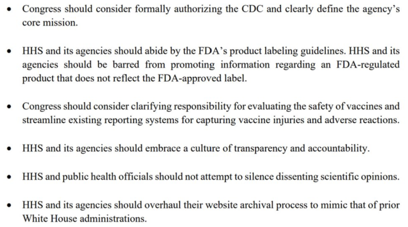 V správe sa uvádza niekoľko odporúčaní vrátane formálneho vymedzenia CDC’s hlavným poslaním zamerať sa na prevenciu chorôb, prinútiť propagandu HHS dodržiavať pravidlá označovania výrobkov FDA’a prepracovať proces hodnotenia bezpečnosti vakcín.