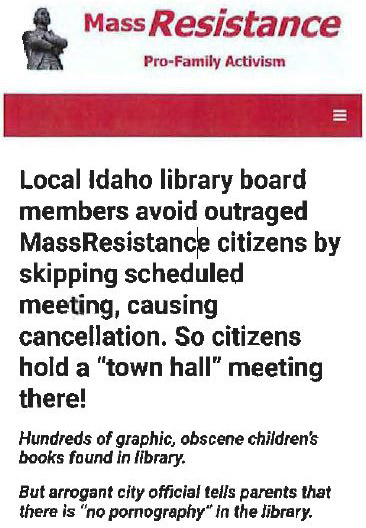 V januári 2023 pomohla organizácia MassResistance veľkej skupine rodičov vo východnom Idahu úspešne sa zorganizovať a vystúpiť proti pornografickým a sexualizovaným knihám pre deti a mládež v ich verejnej knižnici. Jeden z týchto občanov bol zrejme aj dôstojníkom Národnej gardy štátu Idaho. (Jeho právnici držia všetky zúčastnené mená v tajnosti.)