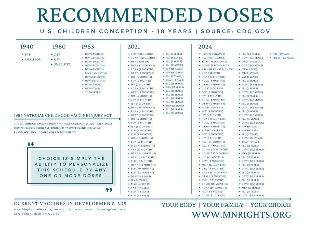 Dieťom sa teraz odporúča vystaviť 36 dávkam vakcín od narodenia do dvoch rokov (štyri dávky u tehotnej matky, 32 dávok u dieťaťa od narodenia do dvoch rokov). Do veku 18 rokov teraz CDC odporúča viac ako 70 dávok pri zohľadnení bežných injekcií COVID-19 a chrípky. To predstavuje obrovský nárast odporúčaných dávok vakcín od vzniku Národného zákona o poškodení detí vakcínami z roku 1986 poskytujúceho výrobcom vakcín plnú ochranu pred zodpovednosťou: