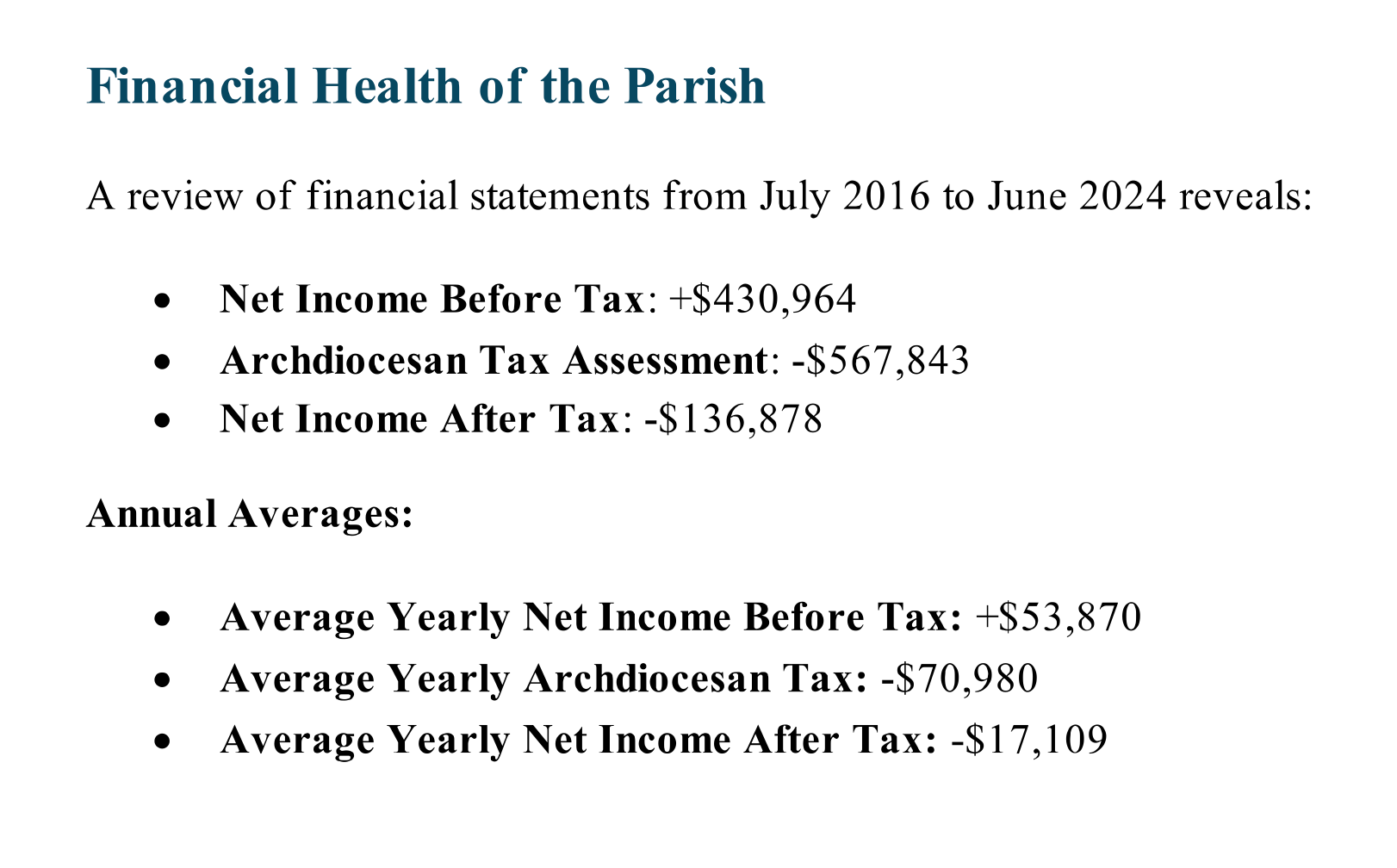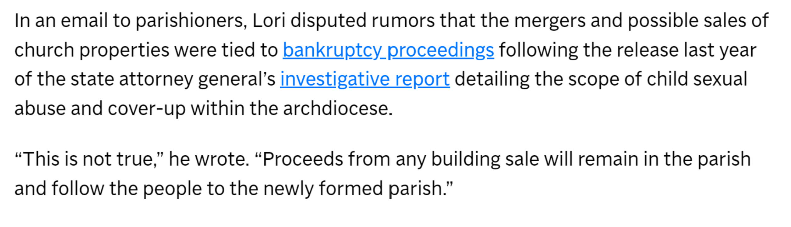 Dalšie otázky o motíve nadmerného zdanenia vyvoláva fakt, že arcidiecéza smeruje výnosy z predaja na zaplatenie dlhov arcidiecézy namiesto toho, aby tieto prostriedky nasmerovala za ľuďmi do novovzniknutej farnosti, ako novinárom povedal arcibiskup Lori.