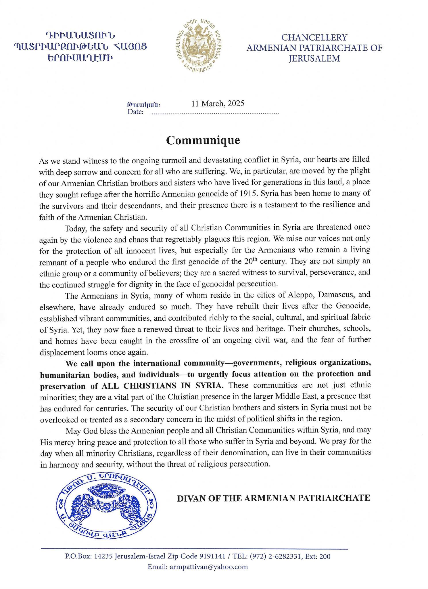Arménsky patriarcha Jeruzalema sa pripojil k ostatným náboženským predstaviteľom vo Svätej zemi a odsúdil vraždenie nevinných kresťanov v Sýrii pod vedením novozvoleného islamského diktátora Abú Mohameda al-Džuláního.