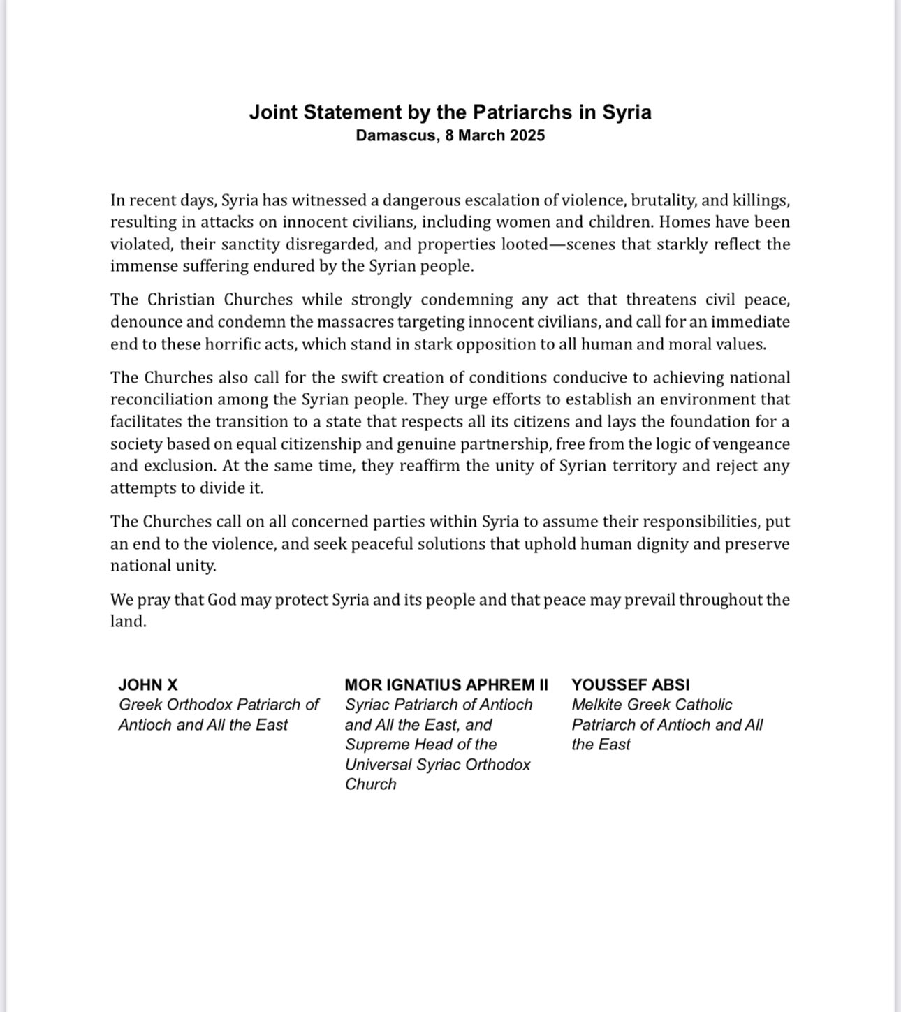 Tento list podpísali sýrsky patriarcha Antiochie a celého Východu, najvyššia hlava Všeobecnej sýrskej pravoslávnej cirkvi, a melchitský gréckokatolícky patriarcha Antiochie a celého Východu. Vyzýva tiež na “urýchlené vytvorenie podmienok, ktoré by viedli k dosiahnutiu národného zmierenia medzi sýrskym ľudom”, pričom ďalej požaduje, aby sa bránila územná celistvosť Sýrie’tvárou v tvár “pokusom o jej rozdelenie.”