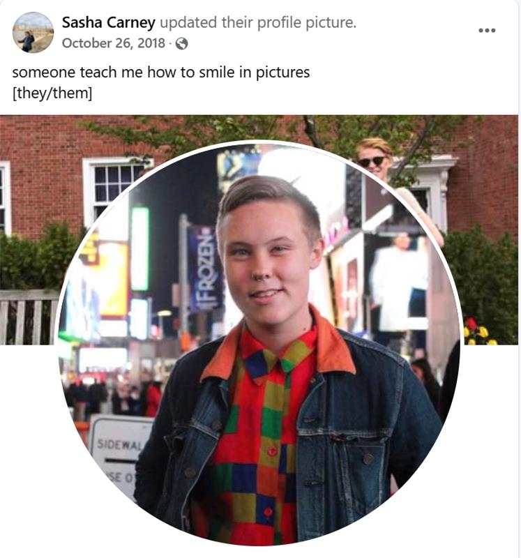 Sasha’na profile na Facebooku, ktorý bol v čase zverejnenia verejne prístupný, uvádza, že sa v roku 2018 identifikovala ako “nebinárna”: