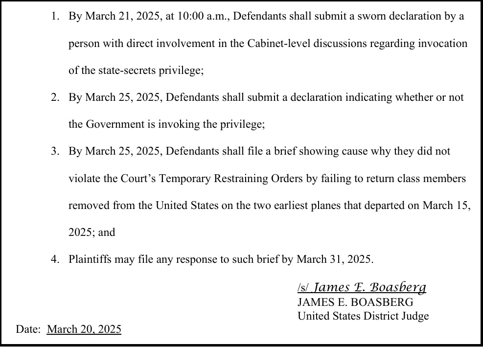 Boasberg potom nariadil Trumpovej administratíve, aby do 25. marca predložila spis, v ktorom vysvetlí, prečo neporušila jeho príkaz tým, že nevrátila dotknuté osoby v dvoch prvých lietadlách, ktoré 15. marca prileteli zo Salvádoru do USA.